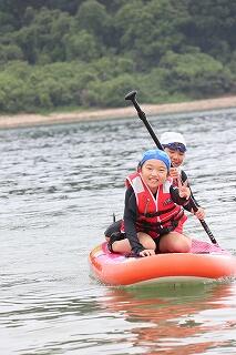 活動は、ライフセービングボード体験、スタンドアップパドルボード(SUP)体験、海岸の清掃活動の3つを3班の活動班が順番に体験していくというものでした。ライフセービングボード体験では、水に浮く練習や素早く救助する体験等を行いました。SUP体験では、ペアを組んでパドルボードに交互に乗りました。清掃活動では、はじめにペットボトル救助の体験をゲーム方式に行い、その後、清掃活動を行いました。子どもたちは、笑顔がたくさん見られ、高松海水浴場のよさを満喫できた様子でした。