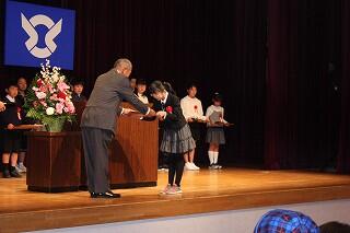 最後にがんばるありあけん子の紹介です。くしま学カルタ大会優勝の6年 津曲和美さんが全校児童の前で紹介されました。