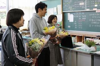 PTA役員の方が転出される先生方へ花束とメッセージを送ってくださいました。