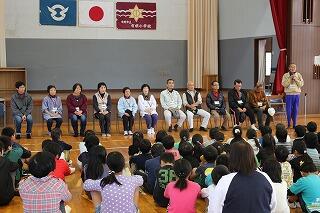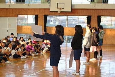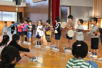 児童集会が行われ、1年生の音読と合奏が披露されました。