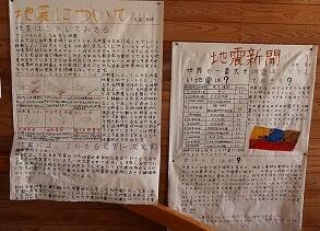 理科室に続く階段、廊下に学習のまとめをした新聞が掲示されています。