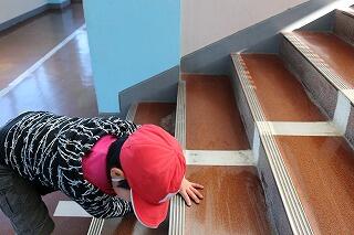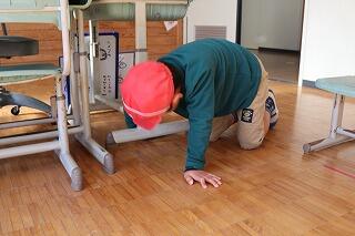 膝をついて隅々まできれいにしています。