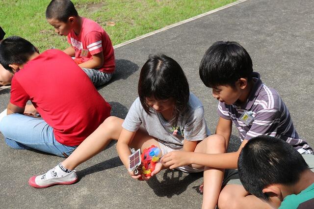天気が良かったので、光電池の勉強を4年生がしました。かん電池との違いやモーターが