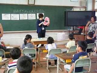 学級活動の時間に1,2年生合同で歯の磨き方の学習を行いました。
