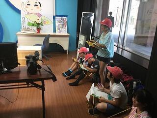 5月26日に、遠足で日南へ出かけました。電車の中でもケーブルテレビ局に向かう間も、うきうきわくわく、とっても元気な子どもたちでした。テレビ局に着くと、まずテレビ局のお仕事についてお話を聞き、質問をしました。次に機材の見学、発声練習を行い、いよいよ実際に機械を動かしたりアナウンスをしたりする体験を行いました。緊張しながらも、うれしそうな表情を浮かべていました。貴重な体験のできた遠足となりました。