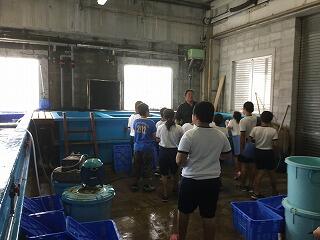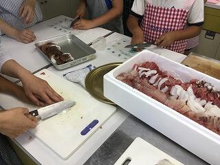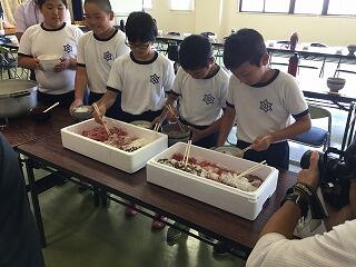 子どもたちが楽しみにしていた行事の1つ、魚しょく体験がありました。まず漁協の方から串間市の漁業について話を聴き、いろいろな質問をしました。次に、漁協の様々な施設を見学し、たこやイセエビなど様々な海の生き物を見たり触ったりしました。そして、いよいよお楽しみの魚の調理を行いました。一人一匹トビウオを背開きにし、いろいろな魚をお刺身の大きさに切りました。最初は慣れない生のお魚に、悪戦苦闘していましたが、次第に上手になっていました!お昼ご飯は保護者の方たちと一緒に、がんばって調理した魚を使った海鮮丼とあら汁をおいしくいただきました。