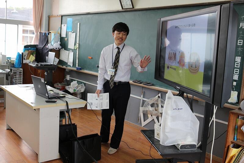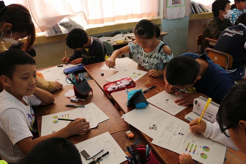 学習したことを相手に分かりやすく伝えるための効果的な様々なグラフの紹介・説明をしてくださいました。講師の先生は、宮崎県庁の統計調査課の方2名に来ていただきました。宮崎市と串間市の人口や産業の割合を比較しました。「数値だけよりグラフで見る方が分かりやすい」ということを実感していたようです。