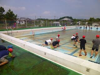 17日(木)全校でプール清掃を行いました。午前中1・2年生でプールサイドをはきました。18名という少ない人数でしたが、ほうき・ちりとりを手に取り、一生懸命つもった灰や砂、杉の葉などを集めていきました。午後からは、3~6年生がデッキブラシやバケツをもって、プールの中まで掃除しました。プールの底に溜まった灰や砂を取り除くのは、とても力がいる作業でしたが、6年生が中心になって掃除をしてくれました。他の学年も何度もバケツで水を運んだり、プールサイドのぬめりをこすったりと、一人一人が自分の仕事を一生懸命取り組んでいました。とても日差しが強かったので、たまに水がかかると歓声が上がりました。プール開きは6月です。きれいになったプールを見て、ますます水泳の授業が楽しみになった子ども達でした。