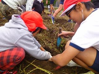 15日(月)に、1,2年生と6年生で芋掘りをしました。1,2年生は生活科で育てたサツマイモを、6年生は理科の実験に使ったジャガイモを収穫しました。縦割り班で6班作り、上級生が下級生のお世話をしたり、仲良く作業したりしながら楽しく芋掘りをしました。