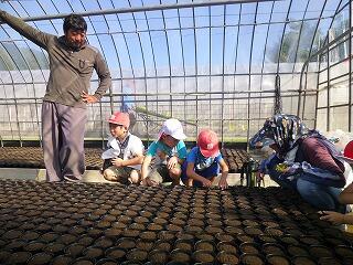 田中農園では、花や野菜の苗や牛の飼育などを行っています。サツマイモと手紙をわたすと、牛小屋へ見学に行きました。ちょうど、赤ちゃん牛がうまれたばかりで、お母さん牛のそばにいました。初めて近くで牛を見る子もいましたが、大きな牛にさわったり、えさをあげたりと大はしゃぎでした。田中さんに、牛の足の形や、鼻のわっかについて質問するなど牛についても勉強することができました。次に、花の苗植えの様子を見学しました。種をまくときは、機械でまくことやたくさんの黒ポットに一度に土を入れる方法などを見せていただきました。実際に、パンジーの苗を植え方を教わり、一人一人ていねいに植えていきました。