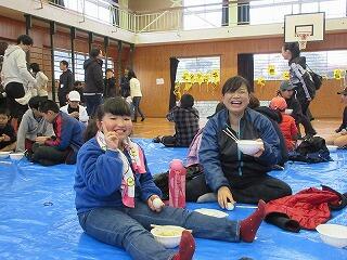 約2時間かけて学校にゴールすると、温かいうどんとゆでたまごが待っていました。みんなで輪になり、温かいうどんとゆでたまごをおいしくいただきました。