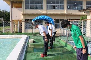 子どもたちが入る前に、これまでずっとありあけん子たちを見守り、安全に水泳学習をさせてくれた有明小プールに、これまでのお礼と今年の安全のお願いをしました。