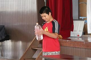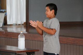圖師先生と子どもたちの「フレー、フレー、団長」のかけ声とともに、団長がじゃんけんで選んだペットボトルを振っていきます。「振れ-、振れー、団長!」