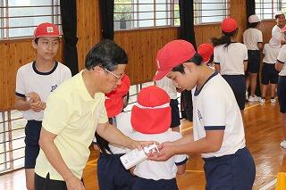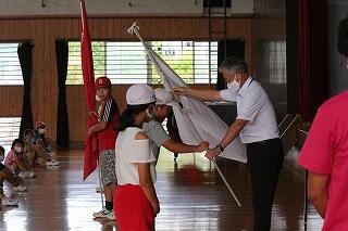 次に校長先生から団旗の授与です。それぞれ「熱い応援」「光り輝く応援」を期待しますというお話がありました。