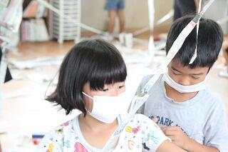 (2年生です。こちらも自己紹介の後、図工の学習で、どんどんつないでいろいろな物をつくっていきました。)