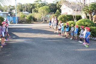 地区毎に当番を決めて、朝、校門に立ち、あいさつをします。