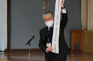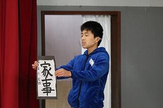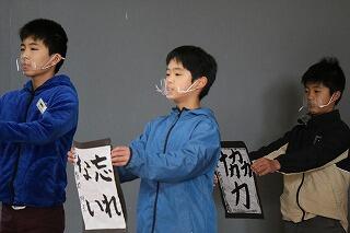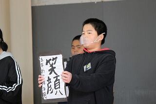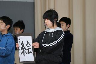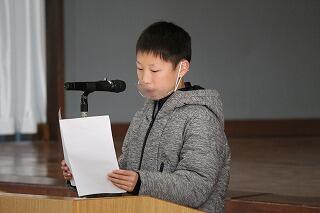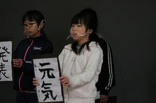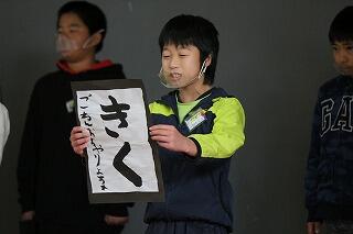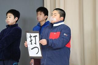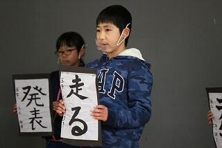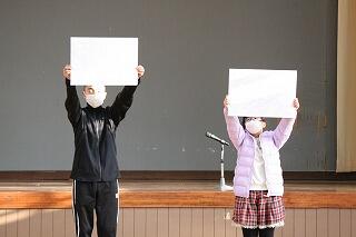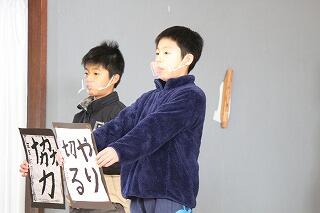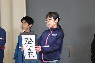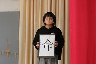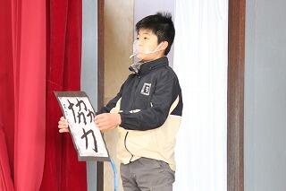 次は5年生の書き初め発表です。自分の選んだ文字を胸に掲げ、なぜ選んだのかをはっきりと発表しました。