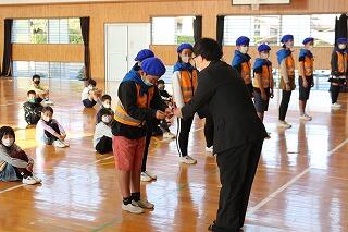 市役所の危機管理課と警察の方をお招きし、6年生が代表してあいさつをし、記念品をいただきました。