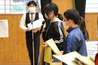 5年代表の萩原創汰さんは、漢字を努力して覚えたこと、アインシュタインの伝記の感想文を頑張って書いたことを発表しました。