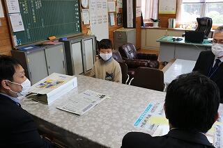 本日3月22日(月)に、宮崎日日新聞社読者室から宮下さん、與さんのお二人がお見えになり、先日17日に新聞に掲載された、新聞感想文コンクール最優秀賞の4年生秋田陽平さんを表彰する会が催されました。