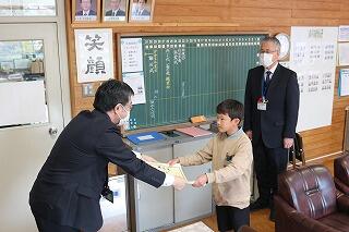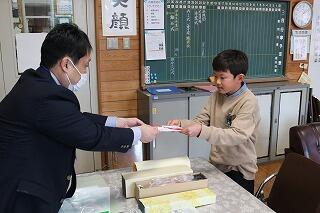 最後に表彰です。「税に関する絵葉書コンクール」に取り組んだ児童の中から、6年生の竹下璃呂さんが奨励賞に選ばれました。素晴らしい取組をみんなで喜びました。