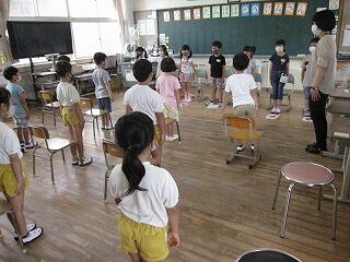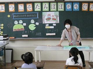 6月24日(木)の2校時に、むつみ保育園児8名、りんぽかん保育園児4名と1年生7名の交流合同授業が1年生教室でありました。これは、次年度1年生となる年長さんが小学校の指導に触れて、入学までの期間を目標をもって過ごしてもらうことをねらいとした取組です。国語の音読、算数の計算など1時間の授業時間で触れ合いながら授業を行いました。1年生は、保育園児のお世話をしながらお手本となる行動をとっていました。1年生が、お兄さん、お姉さんに感じました。