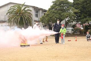 避難後に、串間消防署長さんから、避難の仕方などについて話をしていただき、旭消防設備の方から、消火訓練を体験させていただきました。良い経験を積むことができました。ご協力くださった方、ありがとうございました。