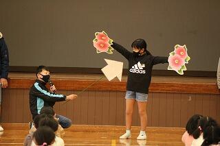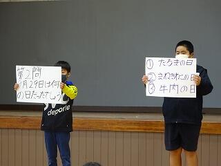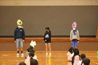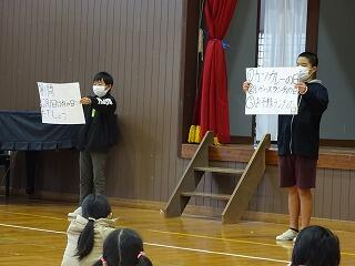 今回の児童集会は、委員会の発表ということで、環境美化委員会と放送委員会の発表でした。始めに発表した環境美化委員会は、現在、卒業式・入学式に向けて育てているペチュニア等の花の育て方を劇化し、分かりやすく説明しました。次に発表した放送委員会は、分かりやすい放送に努めるという放送委員会の目標を説明し、その後、これまで放送したクイズ問題の復習クイズを行いました。