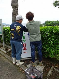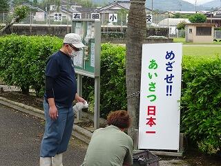 5月17日(火)に正門付近にある「めざせ あいさつ日本一」と書かれた看板の文字が取れかかっていたことから、新しい看板に作り変えました。文字や色等は以前のままです。「一般社団法人ひかり」さんに作成を依頼し、本日、取り付けていただきました。この看板を子どもたちが見て、新たな気持であいさつ運動をがんばってほしいと思います。