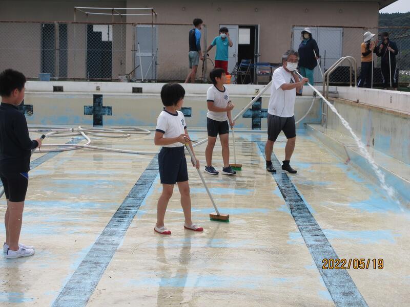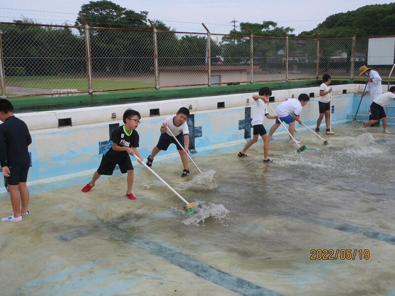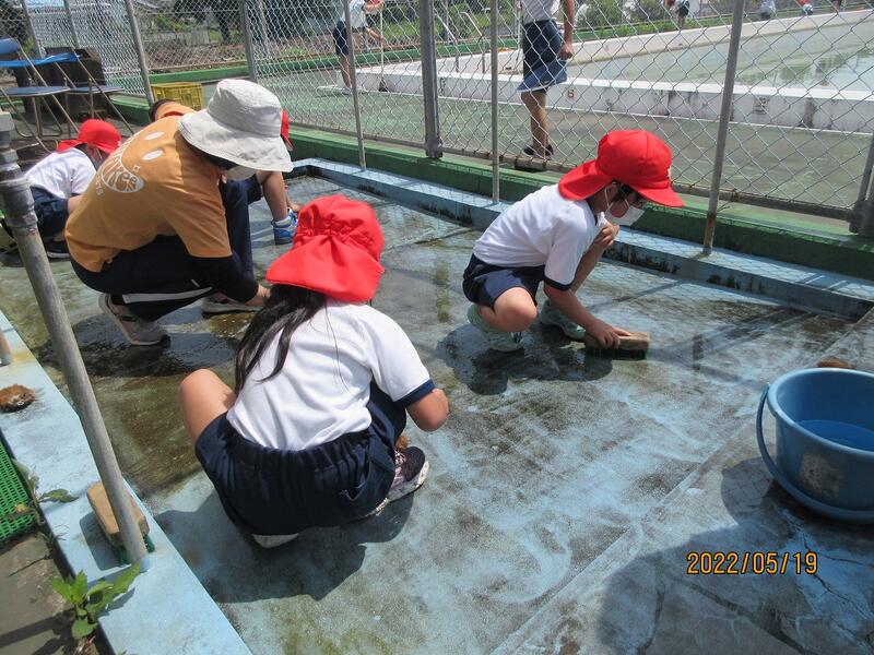 5月19日(木)に全校児童でプール掃除を行いました。1~3年生は3校時に、4~6年生は午後の5・6校時に行いました。