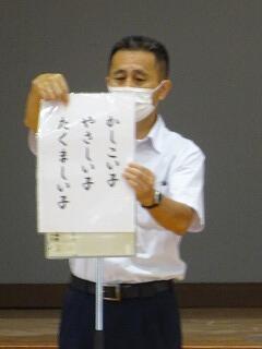 まず、校長先生から「あいさつ日本一」や「登校時に支援してくださる方」、「紹介した詩」について振り返る話がありました。また、教室等に掲示してある目指す児童像(かしこい子 やさしい子 たくましい子)は、有明小の児童がこのように育ってほしいという願いが込められているという話がありました。