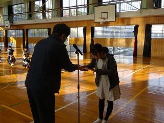 最後に、1月14日に串間市文化会館で行われた「青少年の声を聞く会」に有明小代表として発表した小城海七さんの表彰が行われました。しっかりと自分の考えを発表することができました。