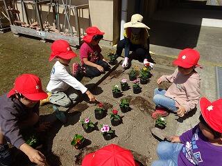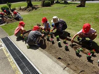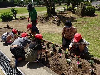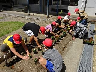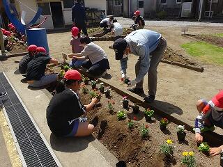 ご協力いただいた地域の皆様、ありがとうございました。写真は、各学年ごとに花の苗を植えている様子です。