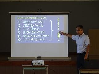 校長先生の話は、「となりのトトロ」に出てくる姉妹のサツキとメイの前向きな考え方を紹介し、人は普段のことでも考え方次第で幸せを感じ、感謝につながることがあるという内容でした。生徒指導部の先生からは、以前JRC登録式を行いましたが、その後、そのとき学んだ「気付き、考え、行動する」ができていますかという確認がありました。JRCの活動は、普段の生活からでも取り組めるので、是非実行してほしいです。
