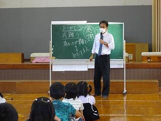 校長先生からは、前回話された旧暦の月を意味する言い方、例えば五月(さつき)や神無月(かんなづき)などのおさらいをした後に、「ありがとう」という言葉の意味について話をしていただきました。「ありがとう」を漢字にしたり、反対の意味を考えたりしながら、「有難う」とは「有ることが難しい、あたりまえではない」ということが校長先生の話から分かりました。先月実施された遠足やふれあい体験で、バスや列車に乗車した時に「ありがとうございました」と言えた子どもたちを校長先生が称賛し、これからも感謝の気持ちを込めて、この言葉が言えるようにしてほしいと子どもたちに伝えられました。