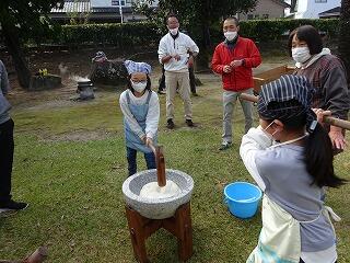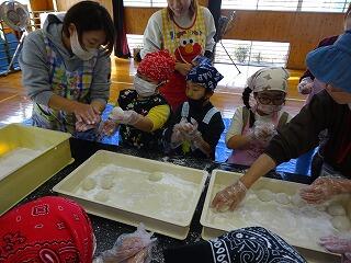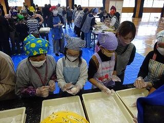 11月26日(日)の午前中、ふれあい広場が実施され、1・2校時は各教室でフリー参観、3・4校時は体育館と入口付近でもちつき会が行われました。今回のもちつき会は、東今町地区と西今町地区の方を中心に地域協力者として参加いただき、準備からもちつき、もちまるめ、片付けまで一緒に活動していただきました。ご協力いただいた地域協力者や保護者のおかげをもちまして、立派なおもちができあがり、子どもたちはよい経験を積むことができました。また、子どもたちにとっては、地域の方と触れ合えたよい機会ともなりました。ご協力、ありがとうございました。