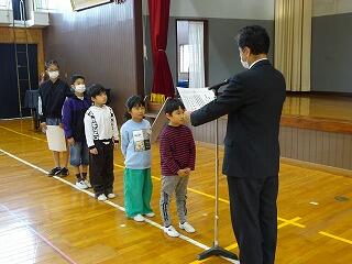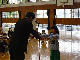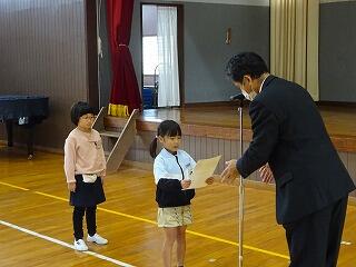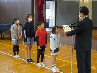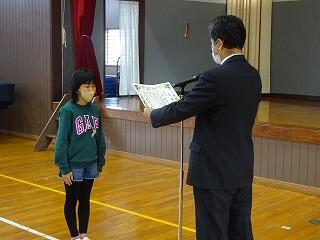 表彰はたくさんあり、「神戸雄一詩碑祭」「西日本読書感想画コンクール」「宮崎県こども造形作品展」「サイエンスコンクール」「宮崎県児童文集ともだち」「体力賞」「串間市陸上記録会」の7つについての表彰がありました。たくさんの拍手を受けるとともに、いろいろな分野でたくさんの子どもたちががんばったことが分かりました。表彰を受けた皆さん、おめでとうございます。