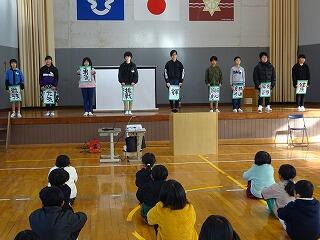 1月9日(火)の2校時に3学期の始業式を行いました。始業式では、2・4・6年生の代表が作文発表を行いました。「絵を描くこと」「運動」「漢字」等、それぞれ3学期にがんばることを発表してくれました。また、年男・年女の5年生は、一人一人今年の目標を半紙に筆で書き、その目標を選んだ理由を含めて今年がんばることを発表しました。