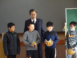 校長先生の話では、能登地震について、大谷翔平選手からいただいたグローブが届いたこと等、話がありました。大谷翔平選手からいただいたグローブは、野球をしている児童が代表で手にはめてみて、もらったうれしさや野球をする仲間が増えてほしいことを感想として話していました。