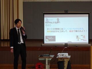 最後に、生徒指導部の先生から、インターネットで詐欺等に合わないように、SNS等の使い方をプレゼンで示しながら説明がありました。携帯電話等が普及し、インターネットで簡単に買い物ができる便利な世の中になっていますが、正しい使い方を理解してほしいところです。