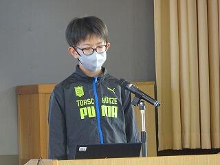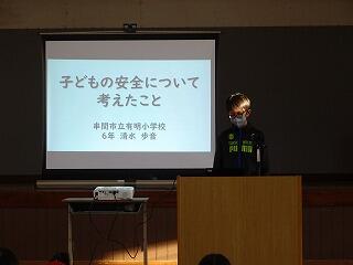 1月11日(木)の朝の活動時間に、1月13日(土)に串間市文化会館で行われる「青少年の声を聞く会」のリハーサルを行いました。この会は、串間市の小・中・高生の学校代表者が自分の考えを発表する場となっています。今年度の有明小学校代表は、6年生の清水歩音さんです。歩音さんは、「子どもの安全について考えたこと」という題で、プレゼンを使って意見発表を行います。今回、学校の皆さんにリハーサルとして発表することで、どんなことを発表するのか知らせることができ、よい発表練習の機会にもなりました。さらに、学校の皆さんからエールをいただけたので、本番、体調を整えてがんばってほしいです。