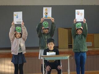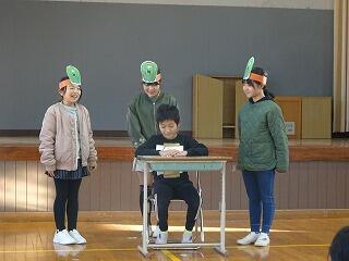 1月24日(水)の朝の活動時間に給食感謝集会を体育館で行いました。この集会は、保健・体育委員会の児童が「好き嫌いをせずに食べよう」というピーマンが嫌いな児童がピーマンを食べるようになる劇を行い、好き嫌いなく食べるように全校児童に呼びかける内容でした。保健・体育委員会の児童が演じた劇は、分かりやすく、おもしろいものになっていて、好評でした。この後、給食でお世話になっている給食センター等にお礼の手紙を届けることになっています。いつもおいしい給食、ありがとうございます。