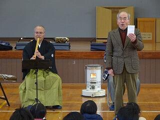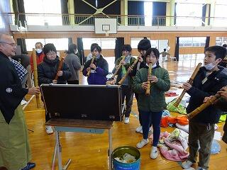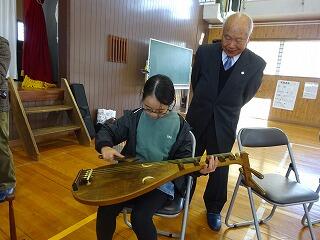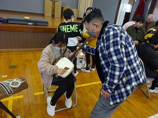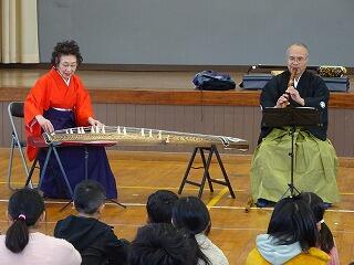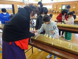 1月24日(水)の3・4校時に体育館で音楽鑑賞を行い、全校児童が参加しました。今回は、日南市文化芸術協会から三味線、琴、尺八、二胡、大和琵琶、詩吟・民謡の先生方に来校いただき、演奏等を行っていただきました。三味線の演奏では、本校の川内先生も演奏してくださいました。後半は、演奏していただいた伝統楽器に触れさせていただき、演奏体験も行いました。児童は、なかなか聴くことができない演奏を聴くことができ、さらに、その楽器に触れるというとても貴重な体験を積むことができました。講師として来校していただいた日南市文化芸術協会の皆様、ありがとうございました。