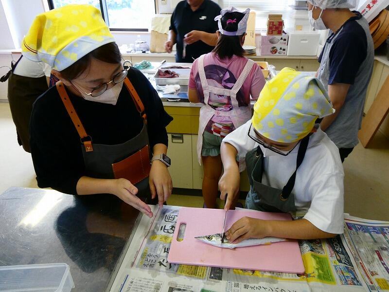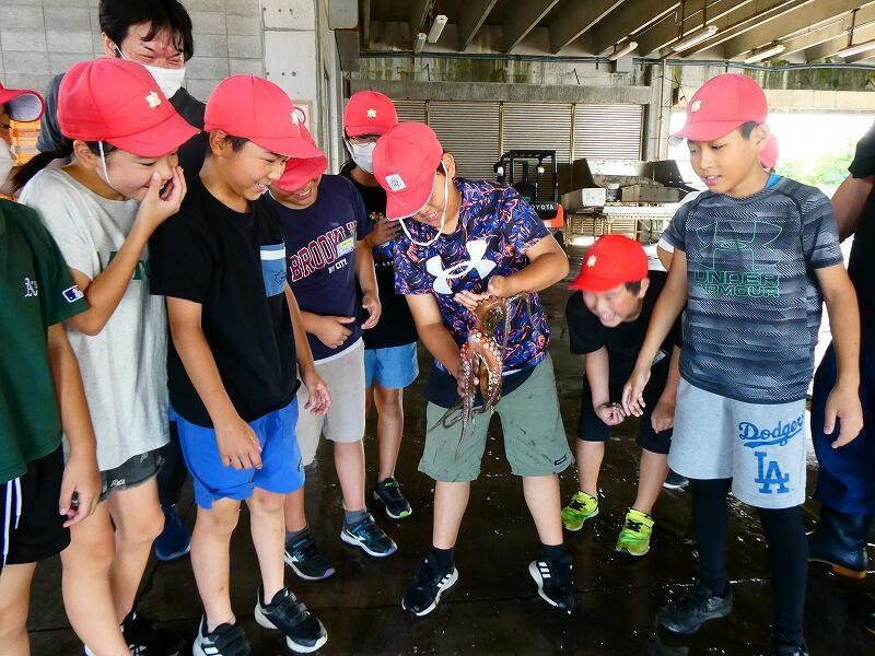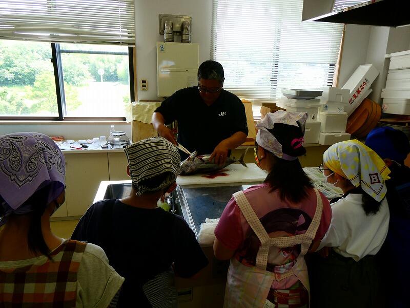 漁港の見学やとれたての魚を見せてもらったりタコをさわったり、子どもたちは目を輝かせていました。ハマチやイサキ、シビなどをさばくところを見せてもらった後、子どもたちはカマスを開きにしました。魚を刺身にしました。普段、魚を切ることはなかなかないので、ぎこちない様子も見られましたが、みんな一生懸命でした。タコやイカも切ってたくさんのお刺身ができました。