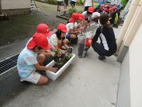 今日(9月11日)の朝の活動の時間に全校で花の苗をプランター植えました。