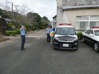 串間警察署の方3名が2台のパトカーで来校され、児童が3名ずつ乗り、2つのコースに分かれて呼びかけをしました。