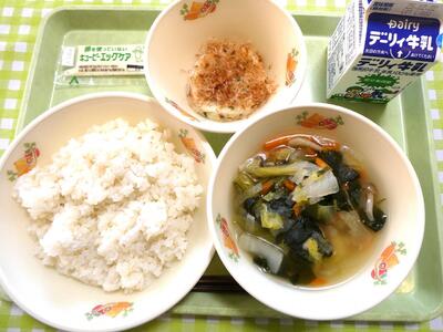 今日の給食のメニューは、麦ごはん、牛乳、桜島どり肉団子のスープ、いかねぎ焼き、エッグケアマヨネーズでした。