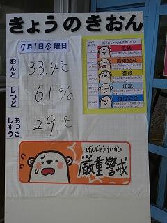 本日より7月に入りました。今週より、気温が高く、蒸し暑い日が続いています。体調管理に気を付けなければなりません。そこで、本校では、校内3か所に気温、湿度、暑さ指数を養護教諭が掲示し、子どもたちも自分で体調管理ができるようにしています。特に暑さ指数を見て、危険な状態の日は、こまめな水分補給が自分でできるようになってほしいです。