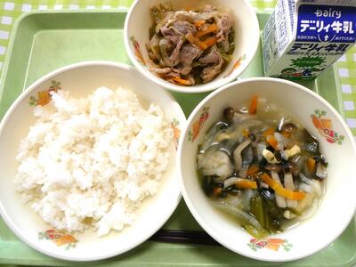 今日の給食のメニューは、白ごはん、牛乳、つみれ団子汁、豚肉の梅しょうが焼きでした。