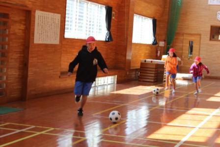 2チームに分かれて ボールを蹴ったり 手で持ったりして 競争しました。